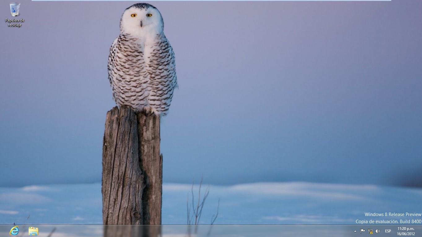 El Escritorio de Windows 8 es idéntico al de Windows 7. La versión final suponemos que Microsoft mostrará el nuevo logo de Windows 8 en el fondo de escritorio. En cualquier caso podrá cambiar el fondo de escritorio por uno mucho más hermoso, ya sea una fotografía familiar, o un bello paisaje.