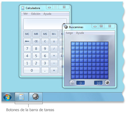 Es en estas situaciones en las que la barra de tareas resulta cómoda. Siempre que abre un programa, una carpeta o un archivo, Windows crea el botón correspondiente en la barra de tareas. El botón muestra un icono que representa el programa abierto. En la siguiente imagen, hay dos programas abiertos (Calculadora y Buscaminas) y cada uno tiene su propio botón en la barra de tareas.