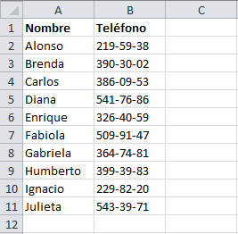 Para probar la función BUSCARV con nuestra tabla de búsqueda ejemplo que contiene información de números telefónicos seguimos los siguientes pasos: