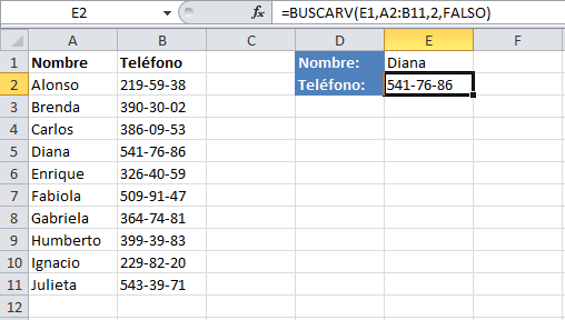 Una ventaja de haber colocado el valor buscado en la celda E1 es que podemos modificar su valor para buscar el teléfono de otra persona y la función BUSCARV actualizará el resultado automáticamente.